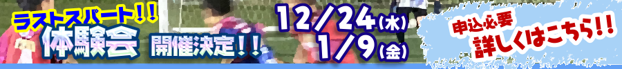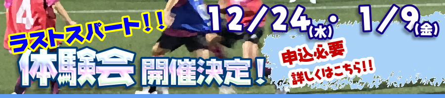 今年度予定の体験会は全て終了いたしました。ご参加いただいた選手、保護者の皆様、ありがとうございました。今後、入会に向けて練習を体験したい場合は、個別対応させていただきますので、電話またはメールでお問い合わせください。
